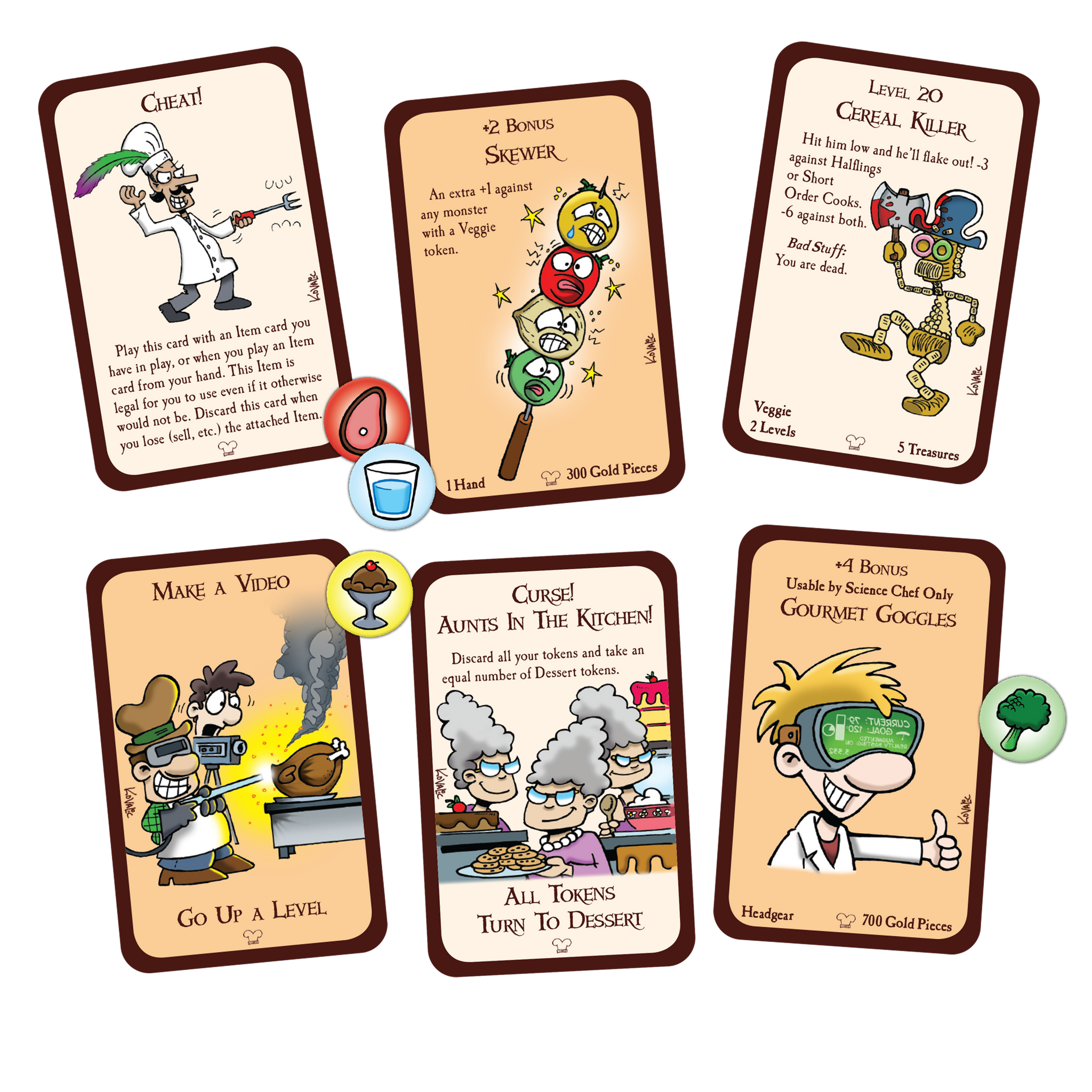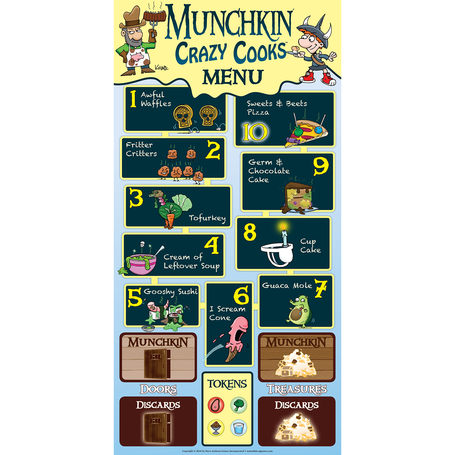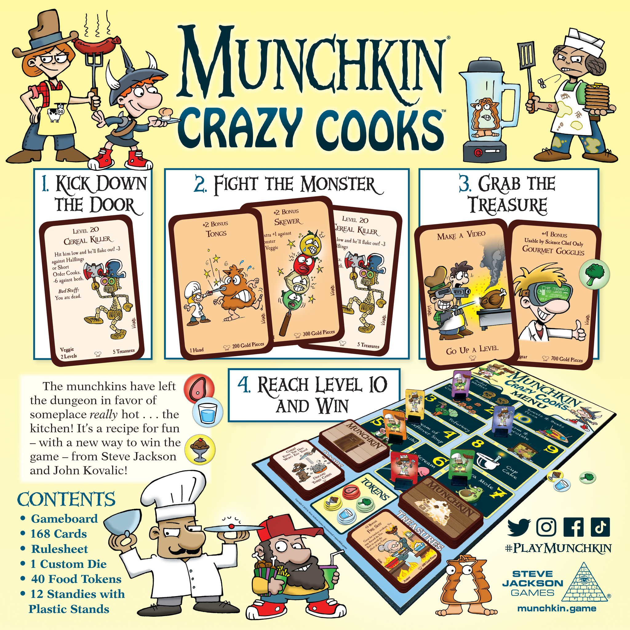 Munchkin Crazy Cooks, puts the adventures in the only place with more backstabbing and treachery than the dungeon: the kitchen! This stand-alone game seats 3 to 6 foodies who can try to stomach corny jokes from Steve Jackson with a ganache of John Kovalic illustrations. Plus, it's designed to be easily shuffled into other Munchkin games to really whet you appetite!