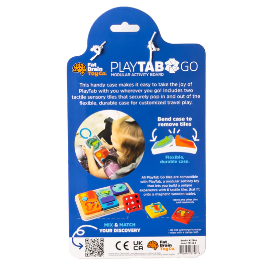 This handy case makes it easy to take the joy of PlayTab with you wherever you go! The two included sensory tiles securely pop in and out of the flexible, durable case, and you can switch them out for any of the other PlayTab tiles. Plus, it has a clip for hanging from a car seat or stroller. Mix, match, and play on the go!