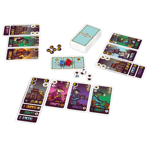 A game consists of a succession of rounds, all of which take place in the same way: first, the active player rolls - and possibly re-rolls - all the dice to which he has access, to validate a pool of dice. Each player then disposes of the resulting icons as they see fit. These icons represent prohibited resources prized by potential customers (each player has their own potential customers). By satisfying a customer's specific needs, they enters the bar and benefits from the permanent bonus: prestige points, resource icons, access to other dice (blue and red dice), to raises, to other potential customers, etc. If ever a player doesn't want to or can't exploit the dice result, they is not stuck! They can either pick up a Moon token to place on one of their cards to unlock a temporary bonus; or replace one of their potential customers with a new one.